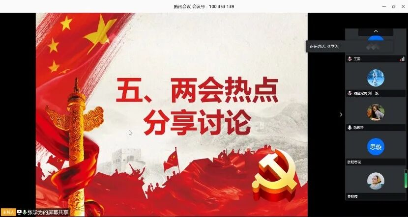 随后,支部同学就近期全国两会的时政热点进行分享讨论,预备党员李韵冰等同学分别从区块链、未成年人保护、保护宠物立法、线上教育等两会热点分享了自己的观点和看法。支部副书记张学为表示,关注全国两会、对提案和热点进行理性、有序的讨论是参与国家政治生活的体现,大学生党员应该主动关注两会热点,关心国家发展。
