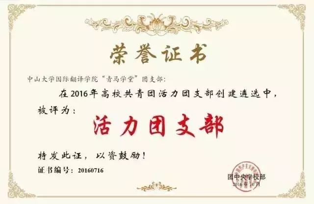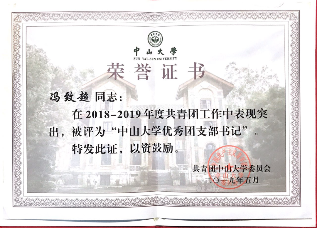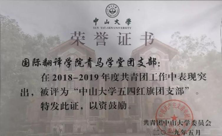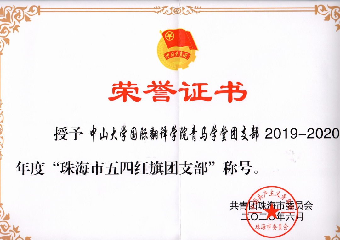 近日,共青团珠海市委员会发布关于表彰 2019-2020 年度珠海市优秀共青团员、优秀共青团干部、战疫一线先进青年、五四红旗团委(标兵)和五四红旗团支部(标兵)的决定。在过去的一年里,中山大学国际翻译学院青马学堂团支部在上级党委和团委的指导下,始终以习近平新时代中国特色社会主义思想为指引展开工作,最终凭借丰富的支部工作成果,荣获2019-2020年度“珠海市五四红旗团支部(总支)”称号!