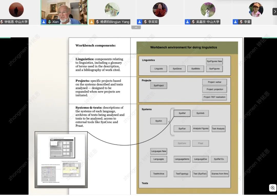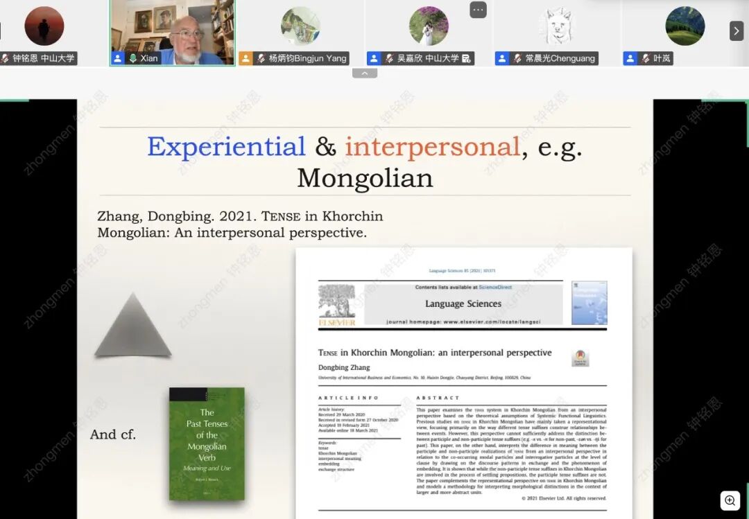 第11场讲座题为“时态与体:世界语言中过程时间的互补模型”。讲座关注语言时态与体系统,聚焦于全球不同语言中时态和体系统的语法化差异及其类型学特征。麦蒂森教授通过跨语言比较,探讨了这些系统如何构建人们对时间流逝中事件开展的经验。研究基于GramBank和WALS等类型学数据库,分析不同语言的时态和体系统,强调从文本和语境中获取数据的重要性。通过概念功能中的逻辑意义和经验意义,结合Bhat(1999),麦蒂森教授基于时态模型和体模型勾勒出经验建构矩阵。麦蒂森教授结合不同语言实例,分析了纯时态系统(如英语)、纯体系统(如汉语)以及混合系统(如现代标准阿拉伯语)的特点,归纳得出东南亚语言倾向于无时态和无体标记,而俄语和阿拉伯语等则倾向于同时具有时态和体标记,结合图例展示不同类型语言在世界上的分布情况。麦蒂森教授指出概念和人际意义之间的互补性,解释时态与体和评估在小句中的作用。麦蒂森教授最后总结,从种系发生的角度来看时态与体之间的互补性,体系统可能演化到时态系统,并探讨了其在语言演化中的意义。在互动环节,来自中山大学等5所高校的3位师生围绕语法范畴、语料来源、研究方法、过程类型等议题提出了4个问题。麦蒂森教授和提问师生讨论了B. L. Whorf的隐性范畴及其与时态和体的关系,强调了不同语言在语法范畴上的显性和隐性差异,探讨了如何通过跨语言比较验证理论假设。