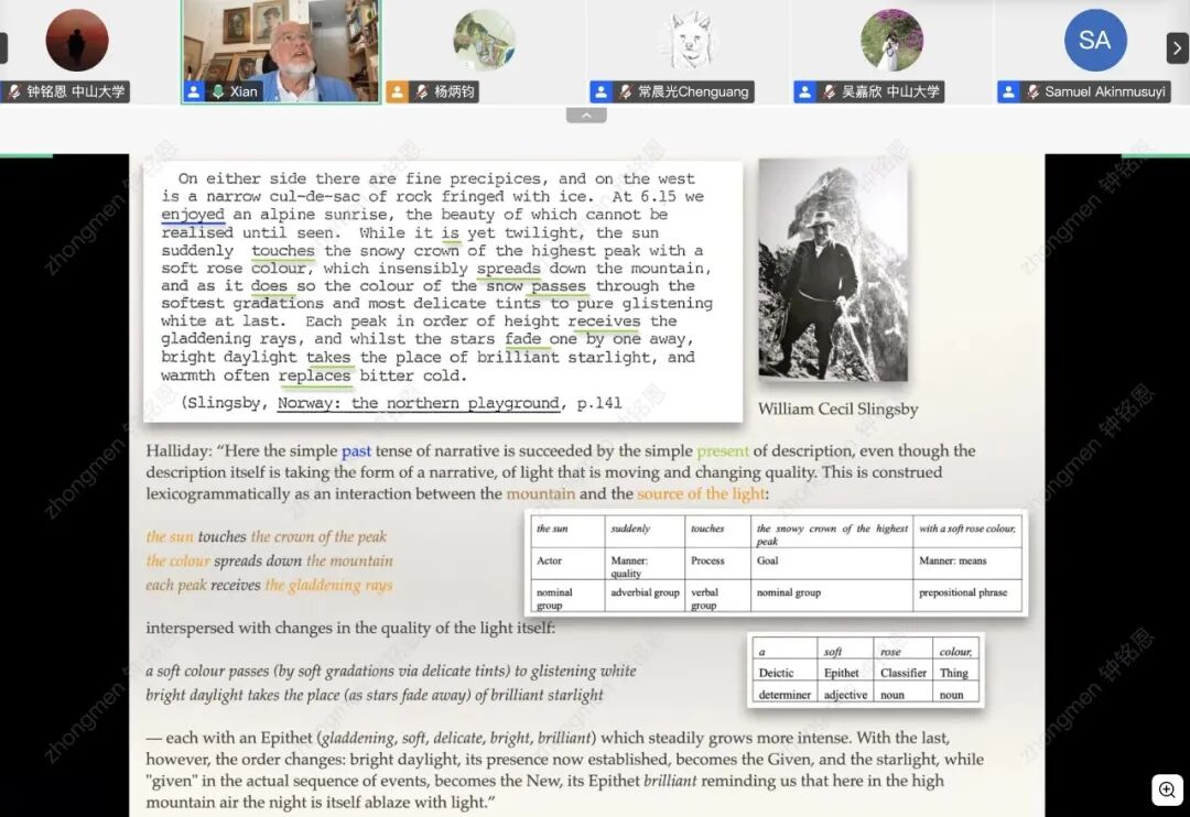 第13场讲座题为“彼得·马蒂森的《雪豹》:他在互补现象领域中构建的一场追寻”。讲座分析《雪豹》作品中自然风光的描写和其他经验领域的呈现,可以结合口头艺术、生态语言学、韩礼德对社会责任的定义(Halliday, 1984)等视角进行分析。援引《寂静的春天》《我孤独地漫游,像一朵云》等作品并结合定量分析,麦蒂森教授展现了有关作品建构自然世界中的经验方式,指出其中一个策略是展现自然之美。麦蒂森教授对作品中自然景象描写的时态、过程类型和形容词进行对比。随后,麦蒂森教授介绍《雪豹》内容,基于不同分析的角度,指出了《雪豹》呼应大自然,描绘自然探险中存在的危险,展现在不同维度之间的穿梭,并结合具体内容进行语篇分析。《雪豹》可以通过实现化层级、实例化连续统和元功能三个维度,以及自上而下、自下而上和自四周至中间三个视角进行分析。麦蒂森教授选取“We look in vain for the pug marks of snow leopard.”一例,说明个案如何同时体现作者对雪豹的观察、过程的展开和完成、以及雪豹的符号象征。最后,麦蒂森教授结合图示,总结《雪豹》中的词汇主题分布、及物性过程类型、以及结合语篇展开和人际立场下的作品结构。在问答环节,来自中山大学、厦门大学、韩山师范学院等4所高校的4名师生就语域类型、语篇分析等议题提出6个问题。麦蒂森教授表示《雪豹》文本可以看做是不同类型语域之间的混合,其中有不同的词汇主题共同作用,语篇分析需要考虑到作品的创作语境和读者接受语境,语域类型会影响具体动词选用。问答环节学术研讨氛围浓厚。